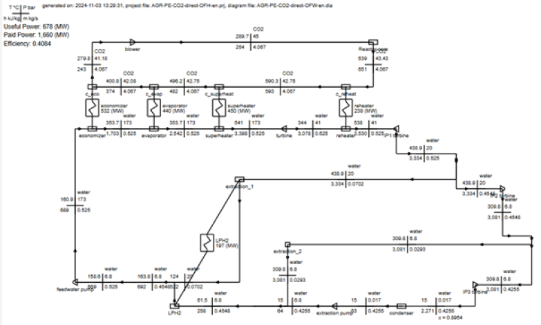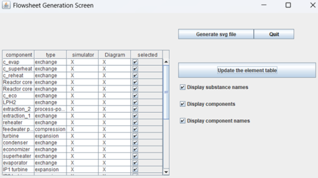 The generation is good, but the three units of the IP turbine are not aligned, making it difficult to display them as in the above flowsheet. Additionally, the connection between the nuclear reactor and the reheater is routed downwards, whereas the component intended to illustrate this reactor has an input at the bottom and an output at the top.