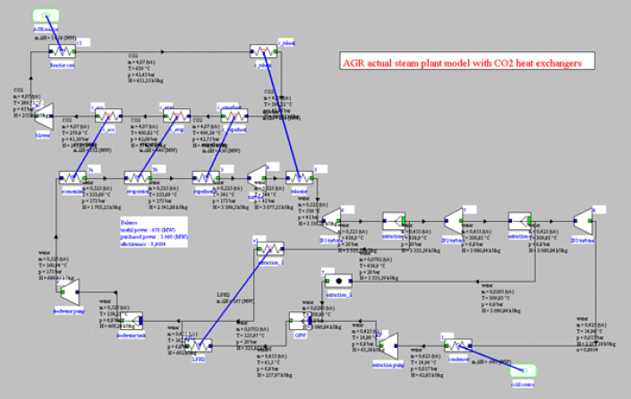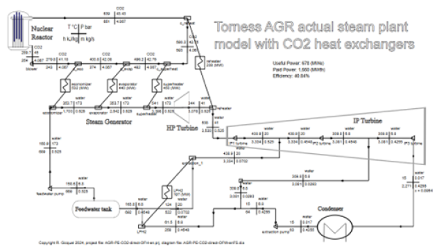 The Figure below shows the usual Thermoptim synoptic view of a model of the Torness nuclear power plant in Scotland, of the AGR (Advanced Gas Reactor) type.