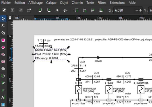Note that if you want to generate several diagrams corresponding to the same Thermoptim diagram but with several parameters, you should generate a common template without the thermodynamic values and save it as is. Then you just generate the thermodynamic values, then open that setup file with Inkscape, select the set, copy them, and then open the frame and paste the values. You will have to drag the values to the right place but this is not very difficult. Finally you save the new diagram under a different name from the one of the template so that the latter can be used again.