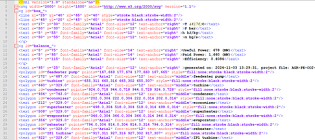 Remarquez que si vous désirez générer plusieurs diagrammes correspondant à un même schéma Thermoptim mais à plusieurs paramétrages, vous avez intérêt à générer une trame commune sans les valeurs thermodynamiques et à la sauvegarder telle quelle. Ensuite, il vous suffit de ne générer que les valeurs thermodynamiques, puis d'ouvrir ce fichier de paramétrage avec Inkscape, de sélectionner l'ensemble, de les copier, puis d'ouvrir la trame et de coller les valeurs. Il vous faudra faire glisser les valeurs à la bonne place mais cela n'est pas très difficile, puis vous sauvegardez le schéma sous un nom différent de celui de la trame afin qu'elle puisse resservir.