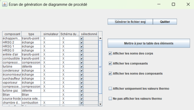 Pour que le schéma svg puisse être généré correctement, il faut que tous les éléments du simulateur aient leurs correspondants dans le schéma Thermoptim, ce qui peut être vérifié et corrigé grâce à l'interface entre ces deux environnements de travail.