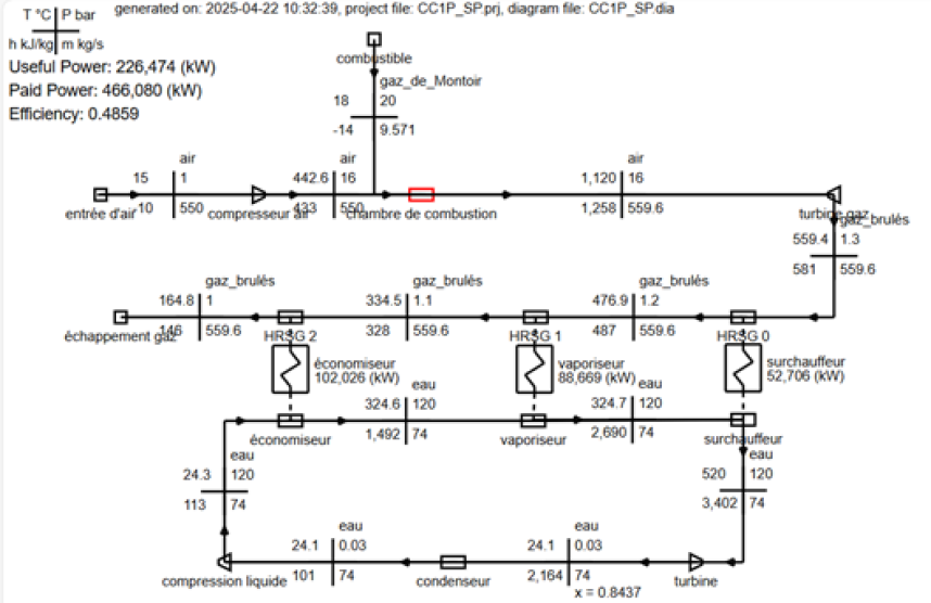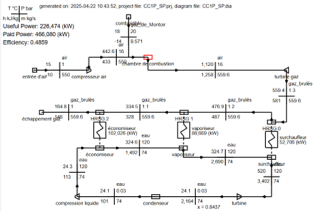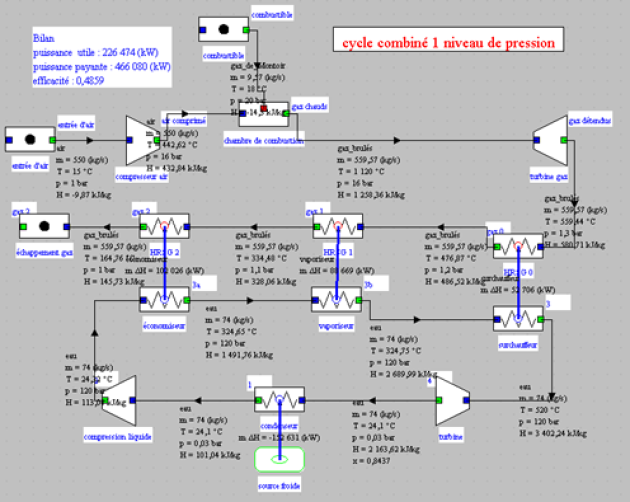 La figure ci-dessous montre le synoptique habituel Thermoptim d'un cycle combiné à un niveau de pression.